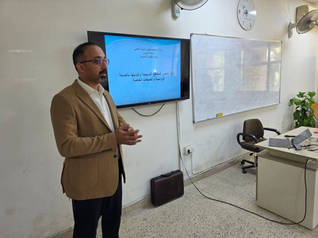 “قسم علوم الحياة التطبيقي يعقد حلقة نقاشية عن طرق تحضير المقاطع النسيجية وتلوينها بالصبغات الروتينية والخاصة”برعاية وإشراف عميد كلية التقنيات الأحيائية الأستاذ الدكتور محسن هاشم رسن، نظم قسم علوم الحياة التطبيقي حلقة نقاشية ضمن موسمه الثقافي للفصل الدراسي الأول بعنوان:”طرق تحضير المقاطع النسيجية وتلوينها بالصبغة الروتينية والصبغات الخاصة بها”، قدمها المدرس الدكتور يحيى ياس خضير.وتناولت المحاضرة أهم الخطوات العملية في تحضير المقاطع النسيجية وتلوينها بالطرق التقليدية والحديثة، مع توضيح أهمية اختيار الصبغات المناسبة لتشخيص التغيرات المرضية بدقة عالية.وتأتي هذه الحلقة ضمن نشاطات القسم العلمية الهادفة إلى تطوير المهارات البحثية والمخبرية لدى الطلبة والباحثين في مجالات التحليل النسيجي والتقنيات التشخيصية.