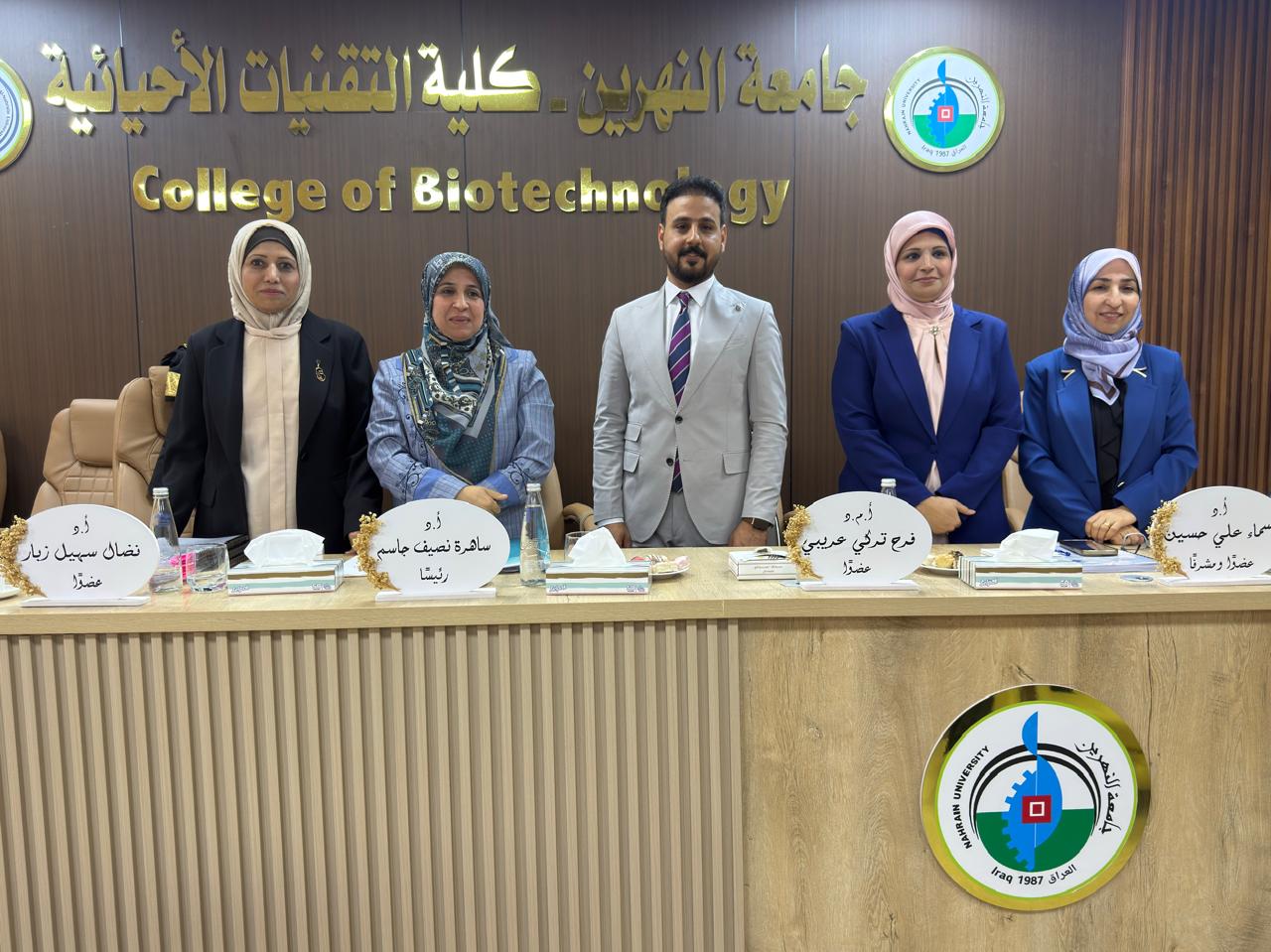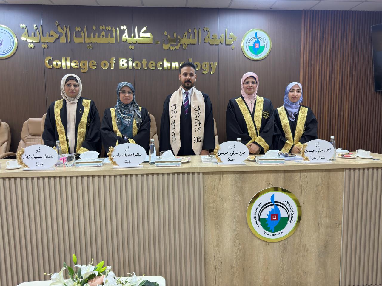 في كلية التقنيات الأحيائية بجامعة النهرين تمت مناقشة رسالة الماجستير للطالب محمد أحمد عبد سلمان بعنوان”توصيف وتقييد إنزيم L-lysine α-oxidase المنقّى من بكتيريا Pseudomonas aeruginosa وتقييم الفعالية الخلوية الضد سرطانية”، والتي نال عنها تقدير امتياز.تناولت الدراسة عزل وتوصيف بكتيريا الزائفة الزنجارية (Pseudomonas aeruginosa) من عينات سريرية مختلفة، وتحديد السلالة الأعلى قدرة على إنتاج إنزيم L-lysine α-oxidase ذي الأهمية الطبية الحيوية. وتمت تنقية الإنزيم باستخدام مراحل متعددة من الترسيب والكروماتوغرافيا للوصول إلى فعالية نوعية عالية ونقاوة متميزة.كما تضمنت الدراسة تحديد الظروف المثلى لإنتاج الإنزيم من حيث درجة الحرارة، ودرجة الحموضة (pH)، ومصادر الكربون والنيتروجين، إلى جانب دراسة تأثير بعض الأملاح والمركبات الكيميائية على فعالية الإنزيم واستقراريته.وأظهرت النتائج أن العزلة المحلية P. aeruginosa (P6) هي الأعلى إنتاجية للإنزيم، والذي تميز بثباته ضمن مدى واسع من درجات الحرارة ودرجات الحموضة. كما بينت اختبارات السمية الخلوية أن الإنزيم المثبّت يمتلك فعالية انتقائية تجاه خلايا سرطان القولون (Caco-2) مع تأثير طفيف على الخلايا الطبيعية (HdFn)، مما يبرز إمكاناته الواعدة كعامل مضاد للسرطان.