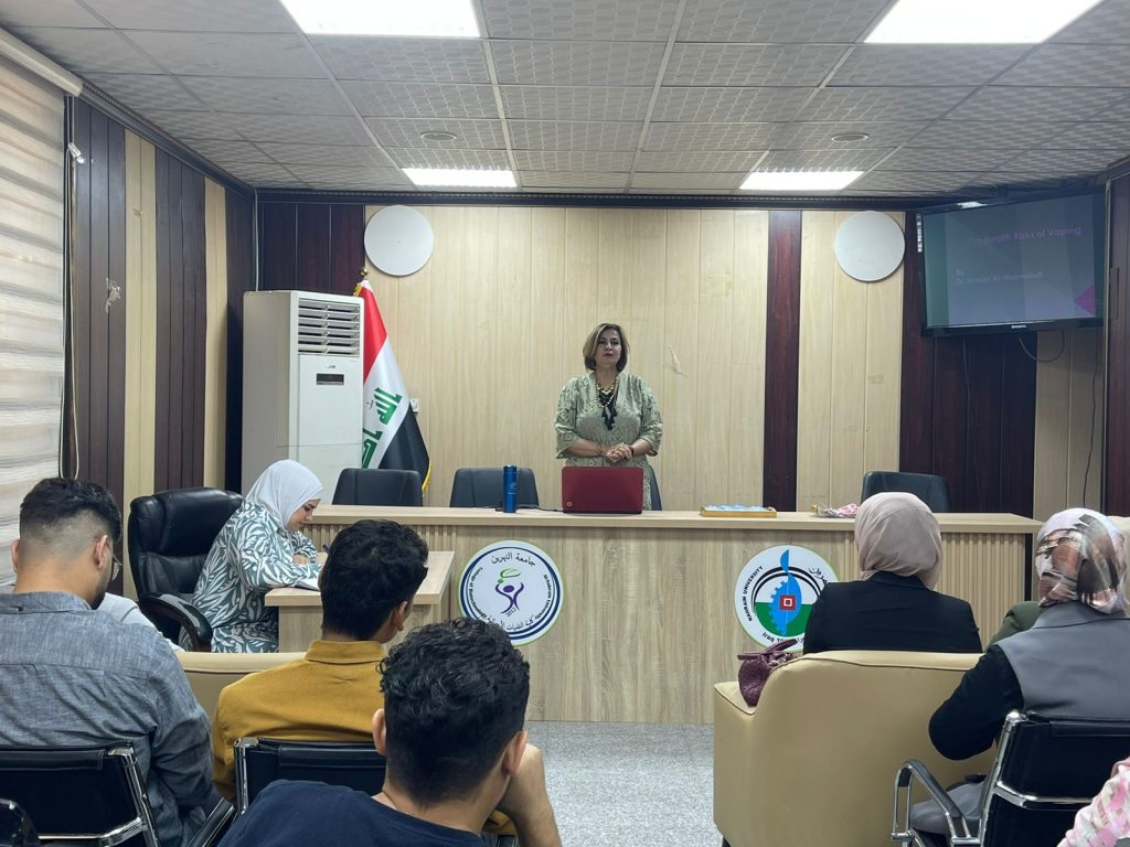 “حملة توعوية في كلية التقنيات الأحيائية بعنوان “الفيب وتحديات الصحة العامة في جيل اليوم”برعاية وإشراف عميد الكلية أ.د محسن هاشم رسن المحترم، وضمن النشاطات التثقيفية لكلية التقنيات الأحيائية / جامعة النهرين، أُقيمت حملة توعوية بعنوان “الفيب وتحديات الصحة العامة في جيل اليوم”، قدمتها د. هناء جاسب سالم بالتعاون مع مجموعة من طلبة الكلية.هدفت الحملة إلى تسليط الضوء على مخاطر التدخين الإلكتروني (الفيب) وآثاره السلبية على الصحة العامة، خاصة بين فئة الشباب، من خلال عرض معلومات علمية مدعمة بالأدلة الحديثة، وتوزيع منشورات تثقيفية توعوية داخل أروقة الكلية.وأكدت د. هناء في ندوتها على أهمية نشر الوعي الصحي بين الطلبة وتحصينهم من الممارسات الضارة التي تهدد صحتهم ومستقبلهم، مشيدة بتعاون الطلبة ومشاركتهم الفاعلة في إنجاح الحملة.