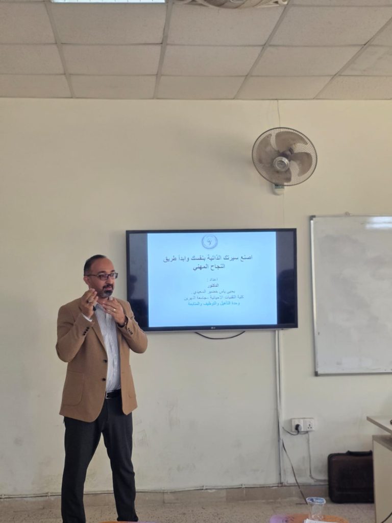 “ورشة تدريبية في كلية التقنيات الأحيائية بعنوان “اصنع سيرتك الذاتية بنفسك وابدأ طريق النجاح المهني”برعاية وإشراف عميد كلية التقنيات الأحيائية في جامعة النهرين الأستاذ الدكتور محسن هاشم رسن، نظمت وحدة التأهيل والتوظيف والمتابعة في الكلية ورشة تدريبية بعنوان “اصنع سيرتك الذاتية بنفسك وابدأ طريق النجاح المهني”، قدمها مسؤول الوحدة الدكتور يحيى ياس خضير السعيدي.هدفت الورشة إلى تعريف الطلبة بأسس كتابة السيرة الذاتية الاحترافية، وطرق عرض المهارات والمؤهلات الأكاديمية بشكل يواكب متطلبات سوق العمل، فضلاً عن تقديم إرشادات عملية تساعد الخريجين على بناء مسار مهني ناجح.